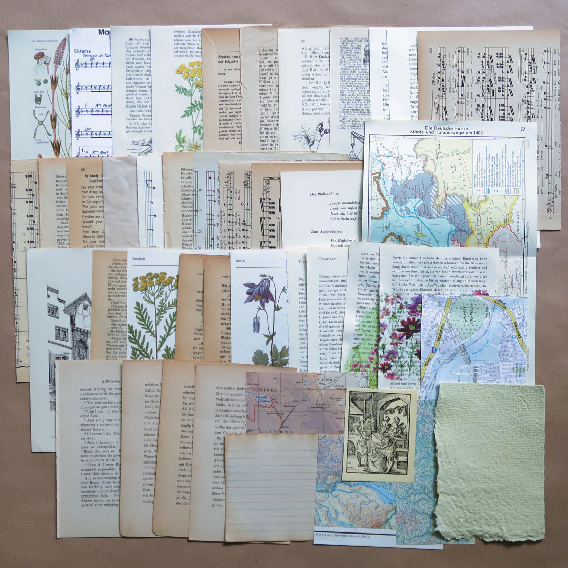 Bild 2 zeigt ein beispielhafte Auswahl an Papieren. Es handelt sich vorrangig um alte Buchseiten mit Schrift oder (meist) floralen Abbildungen (farbig und/oder s/w), sowie Landkarten und Notenpapier. Zusätzlich können hangeschöpftes Papier oder Papier mit Serviettentechnik enthalten sein.